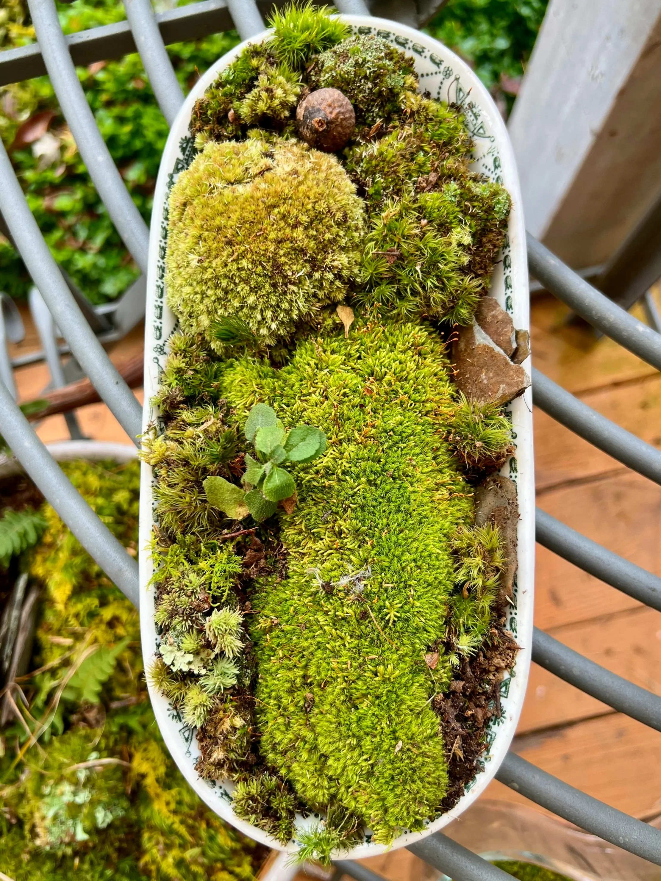 MATERIALS: Moss foraged from the ancestral lands of the Sepascot tribe of the Delaware people; vintage pottery and glass vessels.